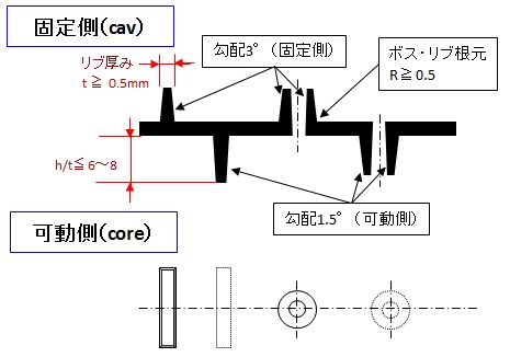1300t機 : 製品投影面積1400㎠ 製品重量2000g - 一般的な抜き勾配(キャビ、コア)